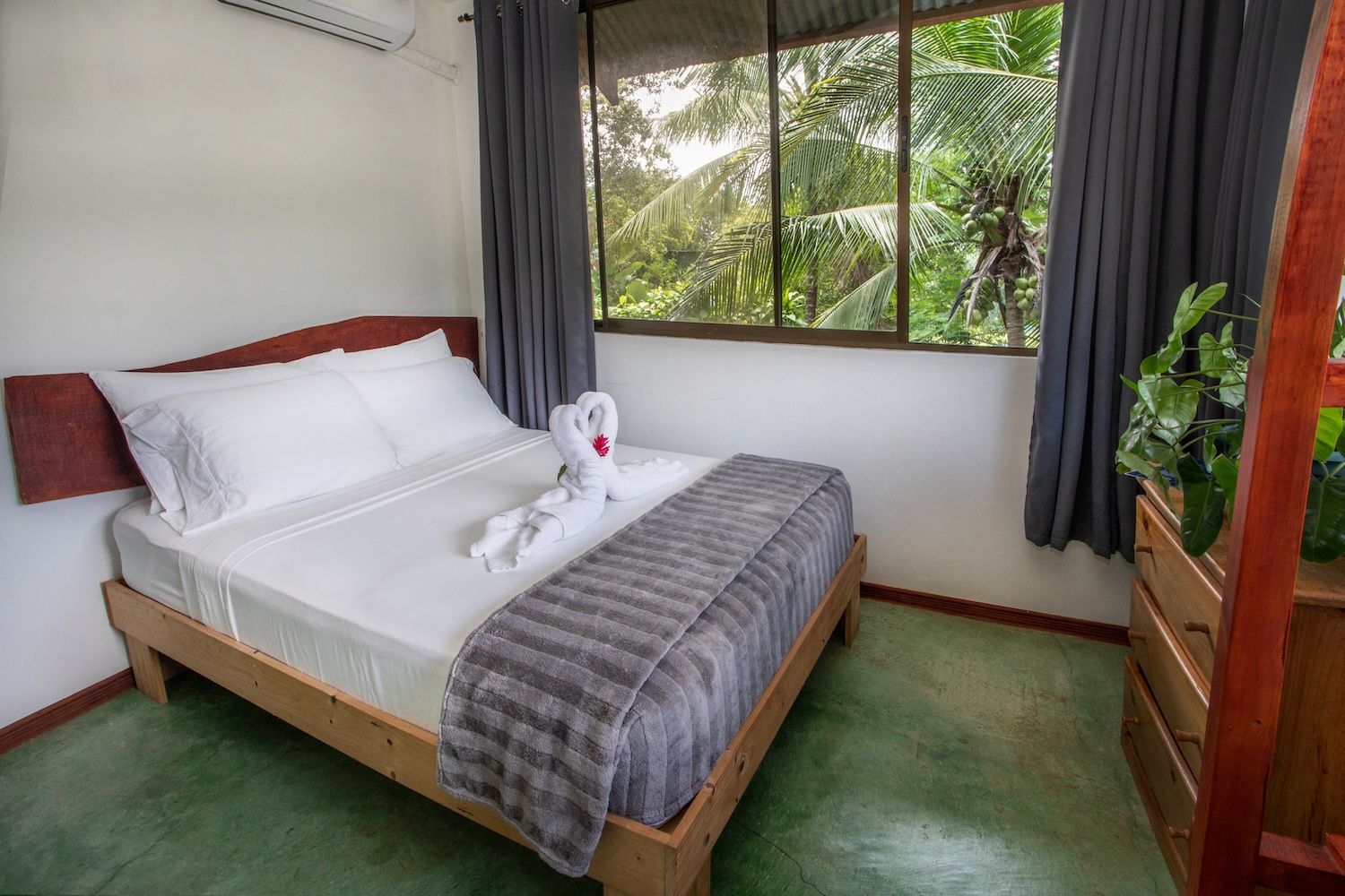 Large private room with double bed, private bathroom, ceiling fan, blackout shades, and air conditioning.