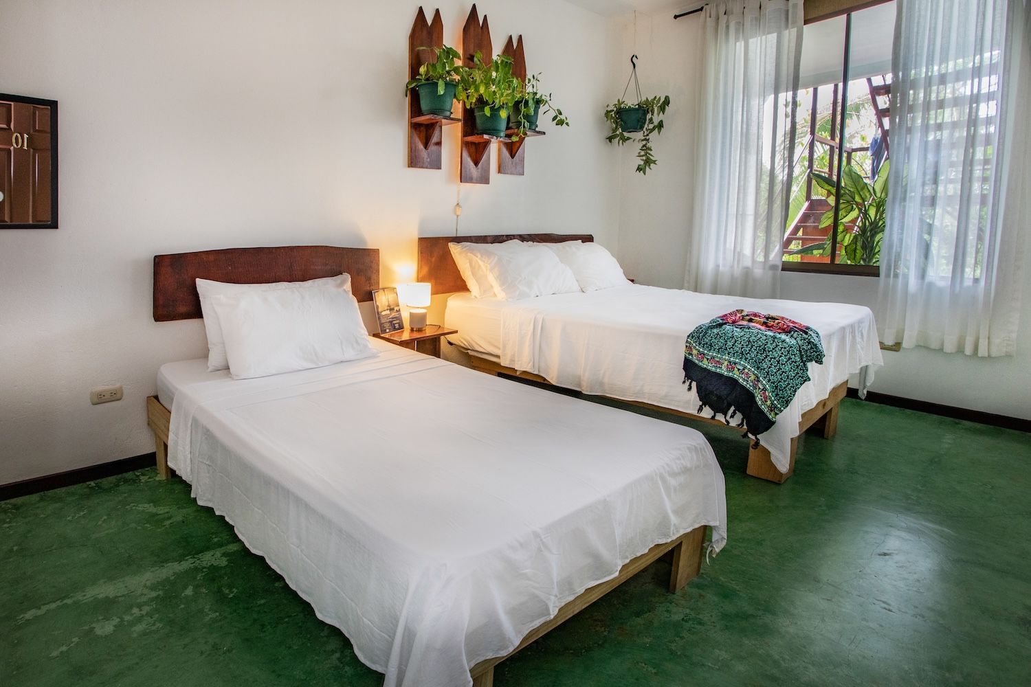 Large shared room for two guests with shared bathroom, air conditioning, and blackout shades.