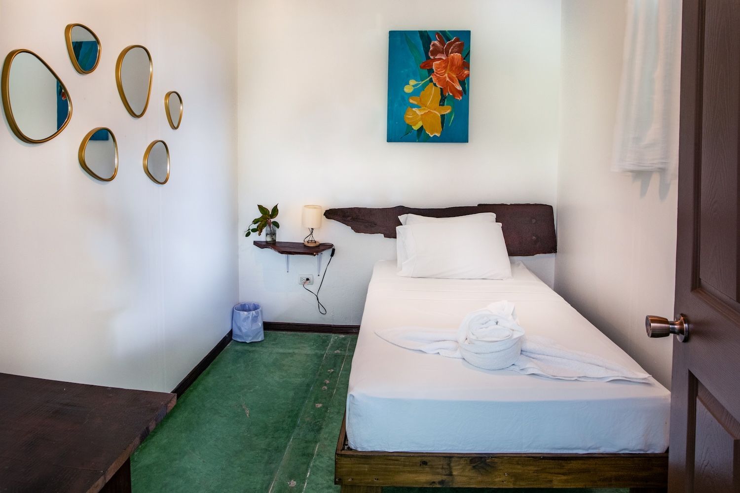 Very small private room with single bed and ceiling fan. Shared bathroom with one other participant. This room is "super economy because the room is small and inside a higher traffic area of the Hotel.