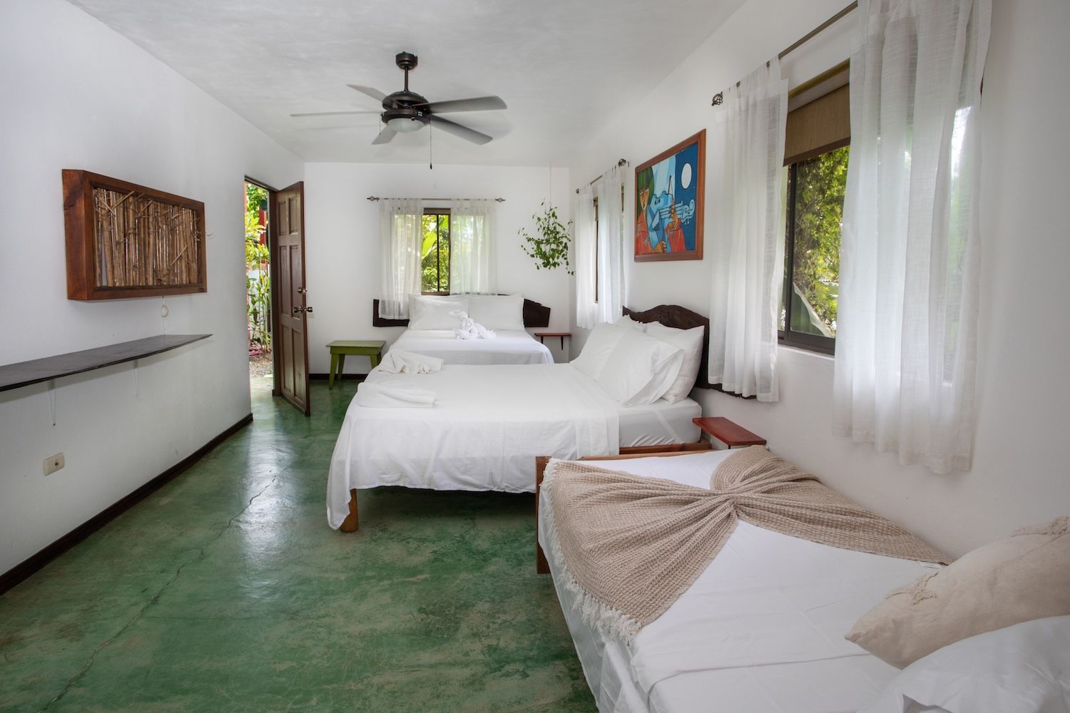 Shared room for two guests with shared bathroom, ceiling fan, and blackout shades.